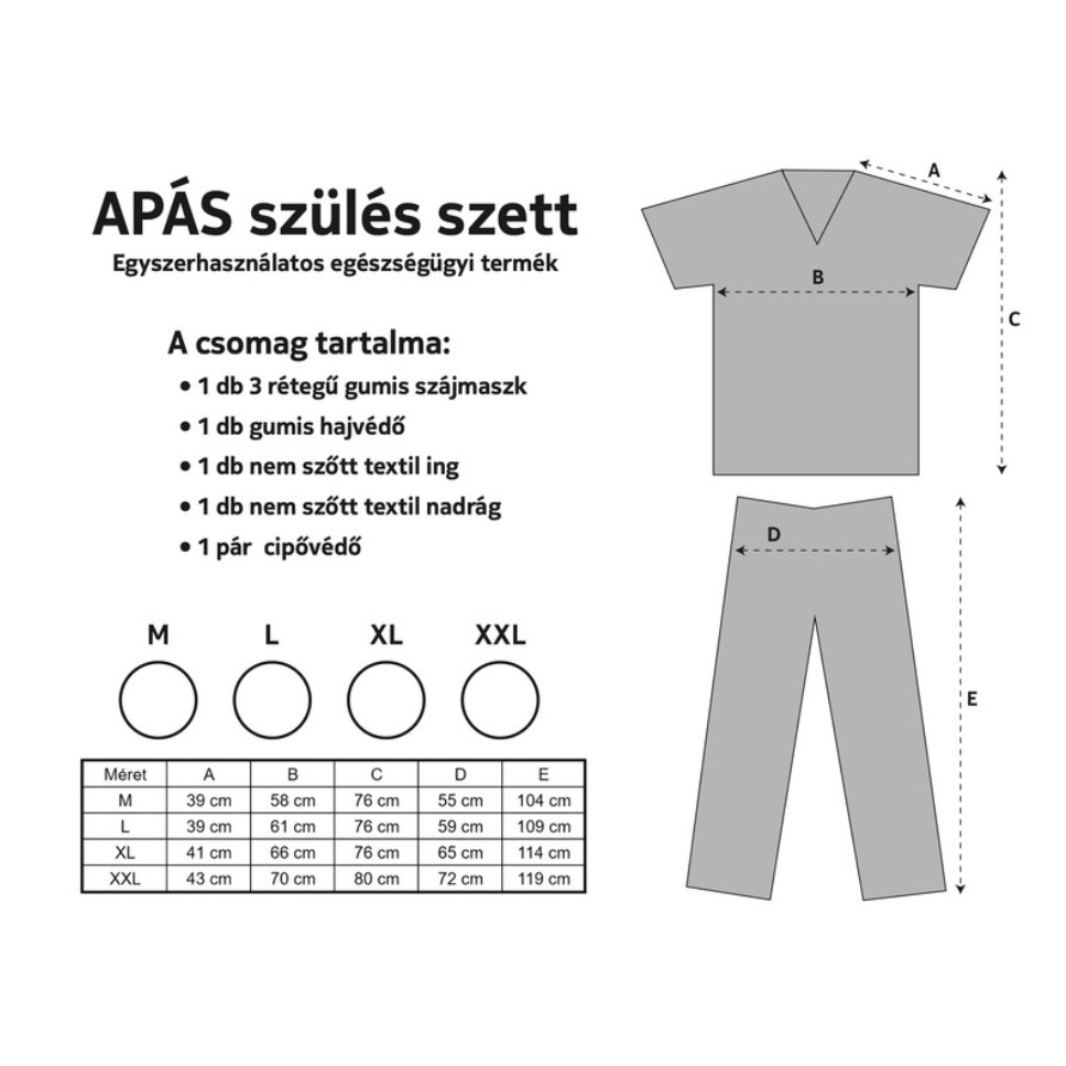 Különböző méretű kispapa szülészeti szett, amelynek viselése elengedhetetlen mindegyik kórházban, segítségével a kispapa beléphet a szülőszobára.