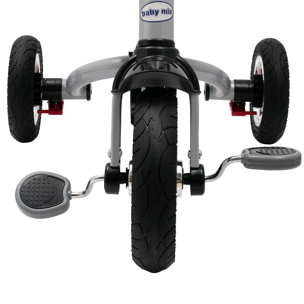 A Baby Mix TYPHOON pedálos gyerek tricikli egy többfunkciós járgány, amely a többi GROW UP termékhez hasonlóan együtt nő a gyerekkel. A triciklit a gyermek és a szülő is kezelni tudja az állítható tolókar segítségével. A tolókar, a felhajtható napellenző és a kartámasz eltávolítása után a járgány pedálos tricikliként használható. Szilárd acélszerkezetének köszönhetően a gyermek sok éven át biztonságosan használhatja. Kényelmes ülése 360 fokban elforgatható, így a gyerek a haladási irányban vagy azzal szemben is haladhat. A közlekedés során a levehető kiesésgátló keret, a hárompontos biztonsági öv, a kényelmes leszerelhető lábtartók és a gumi kerekek gondoskodnak a kényelemről és biztonságról, amelyek nagyszerűen elnyelik a felületi egyenetlenségeket, tökéletes tapadást biztosítanak, és nem igényelnek utánfújást. Praktikus kosarában játékok és más kellékek is tárolhatók.