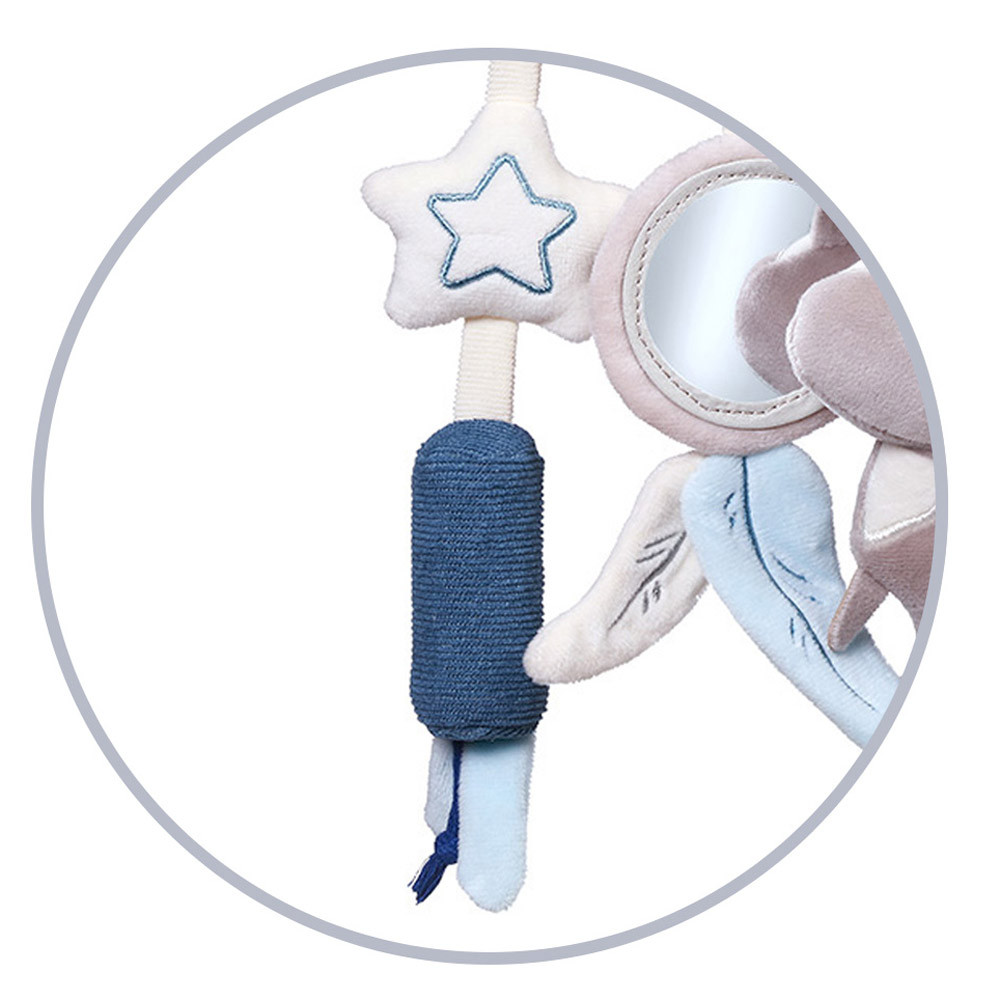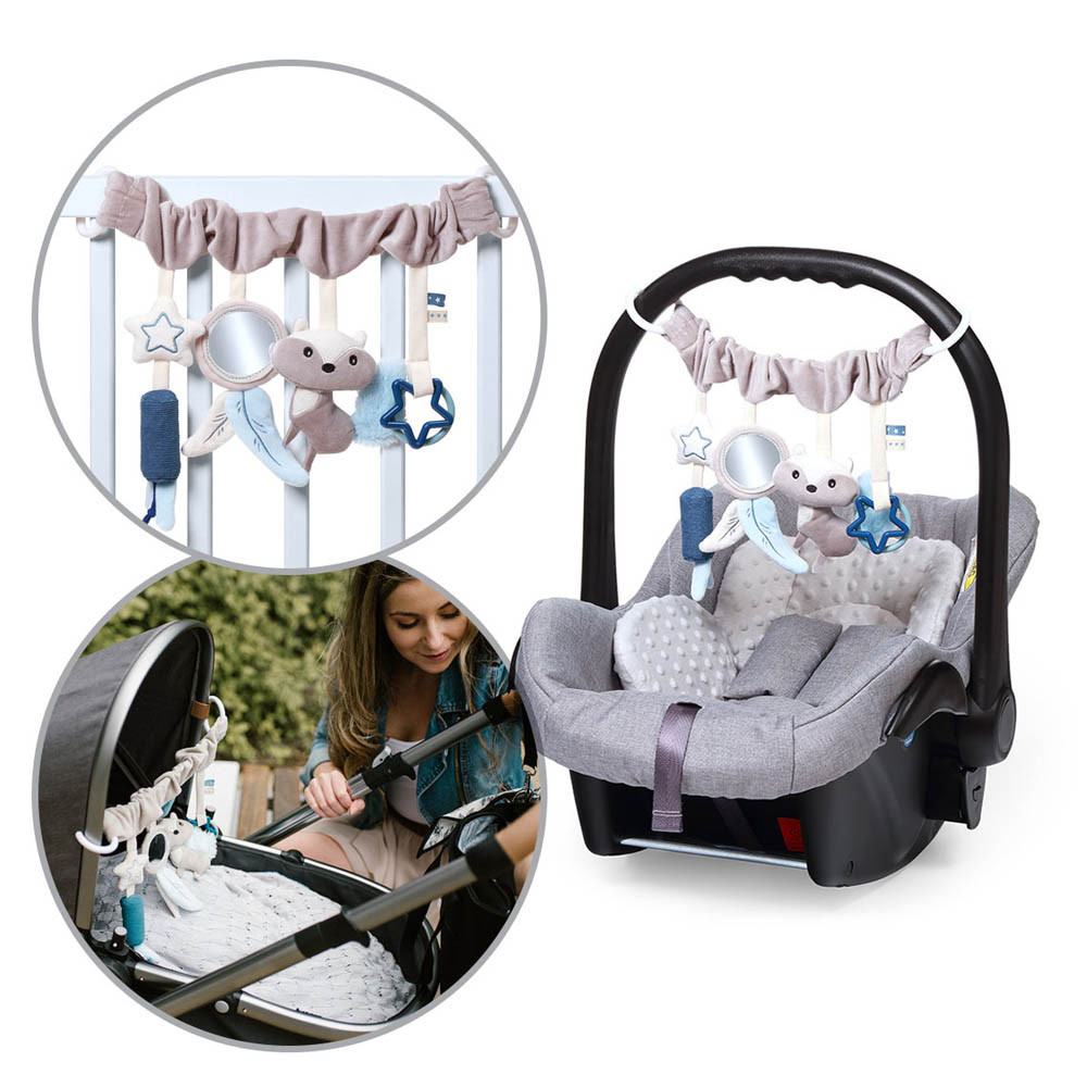 Rögzítse babakocsihoz, kiságyhoz vagy autósüléshez, hogy a baba elfoglalt legyen séta vagy utazás közben. A játékhoz egy susogó farkú csengettyűs mosómedve, egy csillag karikával rágóka és egy csillag tartozik, ami nagyon kellemes tapintású anyaggal van bevonva. A gyereknek kínált egyéb tárgyak közé tartozik a tükör. Az érdekes elemek választéka, amelyek kellemes tapintásúak, és változatos kialakításukkal és színükkel felkeltik a baba figyelmét. Lehetővé teszik babájának, hogy felfedezze a világot, és játékon keresztül fejlessze manuális készségeit.
