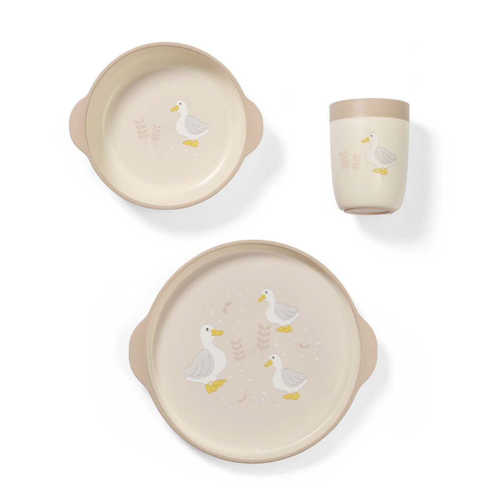 Mivel a tányér, a tálka és a pohár csúszásmentes aljjal rendelkezik, illetve a tányérok magasított oldalfallal, csökken a kiborulás esélye és megkönnyíti a gyermek önálló étkezését. Garantálja a kisgyermek magas kényelmét és a szülők számára a kevesebb rendetlenséget.