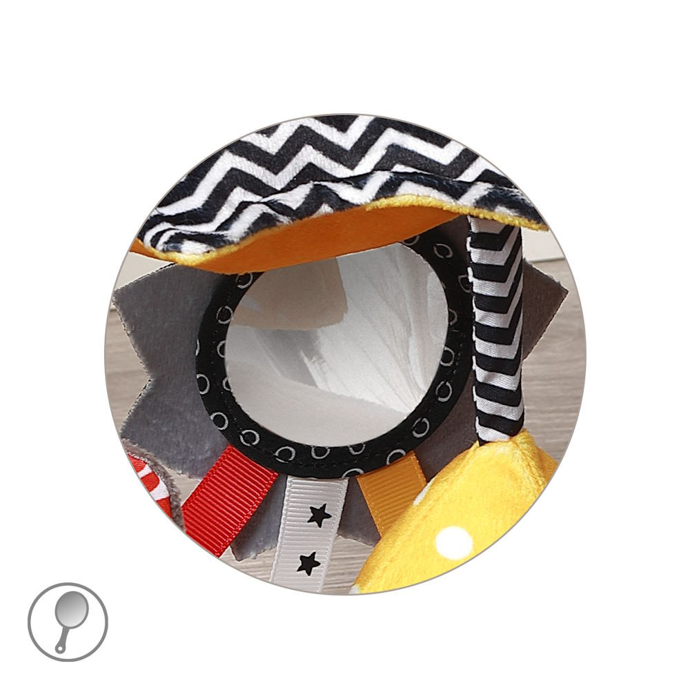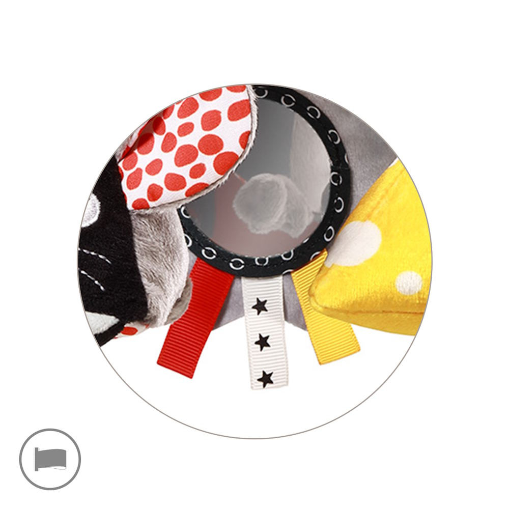 Két csörgővel és susogó elemmel szereltük fel, amelyek serkentik a hallást, színes címkékkel és egy göndör farokkal, amelyek ösztönzik a fogást, valamint egy biztonságos tükörrel, hogy felfedezhessék a saját tükörképüket. Kontrasztos színekben és geometrikus mintákkal alkottuk meg, hogy az élet első hónapjaitól kezdve fejlessze a látást.