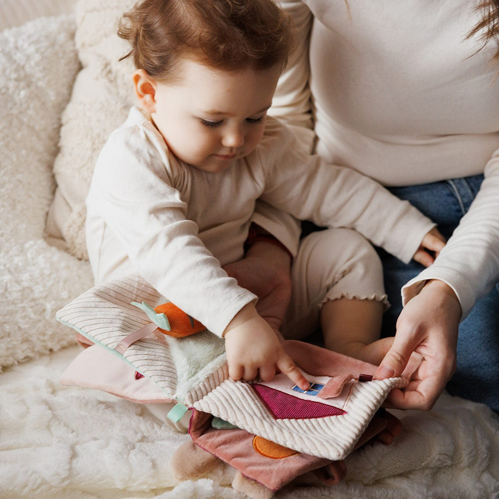 Stimuláló könyvünk lapjai tartalmaznak egy susogó elemet, amely gyűréskor érdekes hangokat ad ki, egy csörgőt, amely rázásra ösztönzi, egy tükröt, amely lehetővé teszi gyermeke számára, hogy felfedezze saját tükörképét, címkéket és zsinórokat, amelyek ösztönzik a fogást, valamint egy rágókát, amely masszírozza az ínyét.