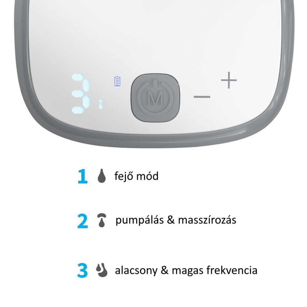 - 2 az 1-ben mód - Egy 8 masszázs mozdulatból és 1 szívásból felálló ciklus ismétlése. Ez a mód a túltelt mellek megnyugtatására ajánlott, és stimulálni is lehet vele a melleket annak érdekében, hogy több anyatejet kevesebb idő alatt nyerhessünk ki.
