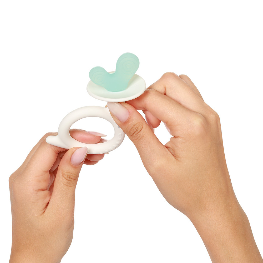 Biztonságos anyagokból és ergonomikus formában készült, amely tökéletesen illeszkedik a kis kezekhez. A különböző domború részek gyengéden masszírozzák a baba ínyét és segítik a babának felfedezni a szilikon anyag sokrétűségét.