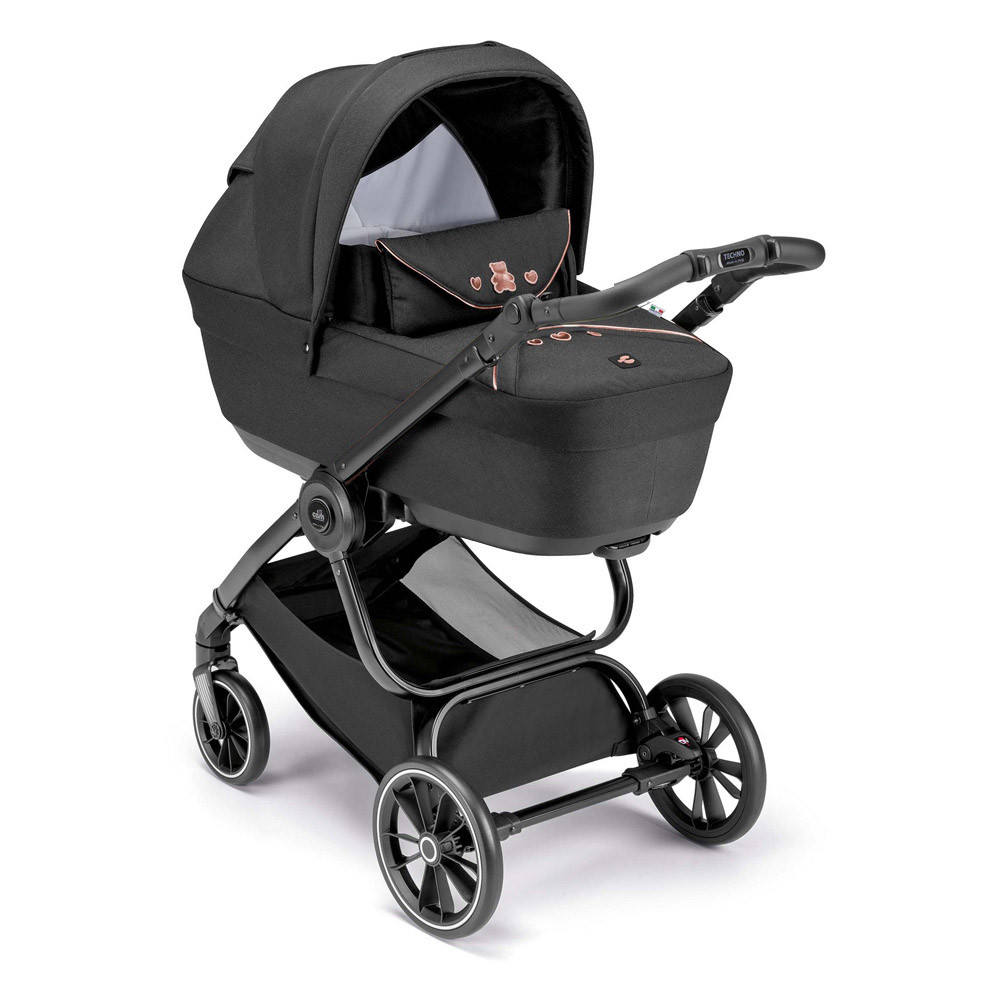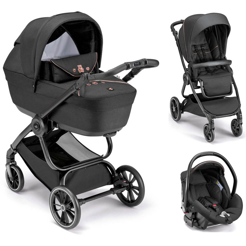 Tartalma: Techno Deluxe váz, mózeskosár, babakocsi ülés, hordozó, pelenkázótáska.