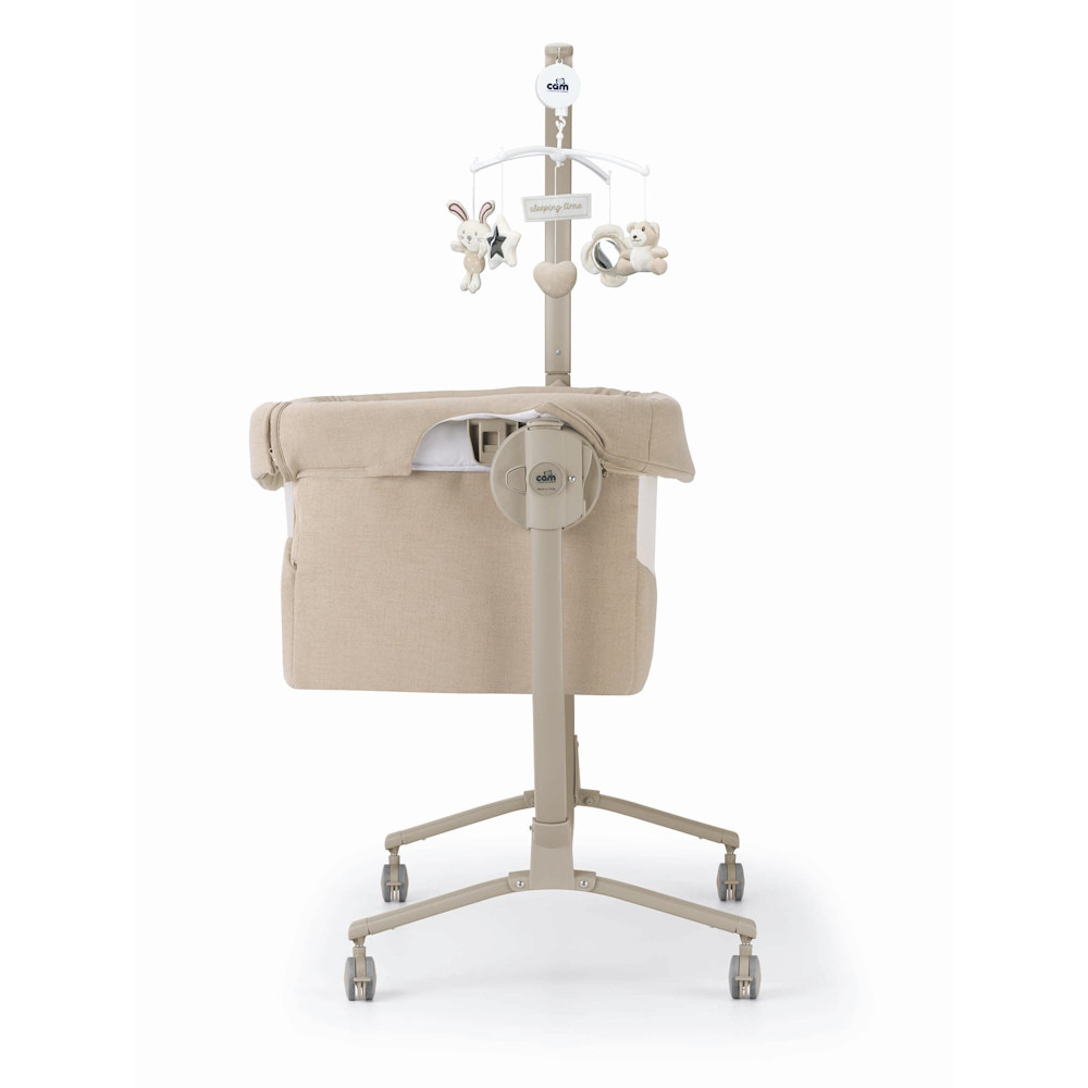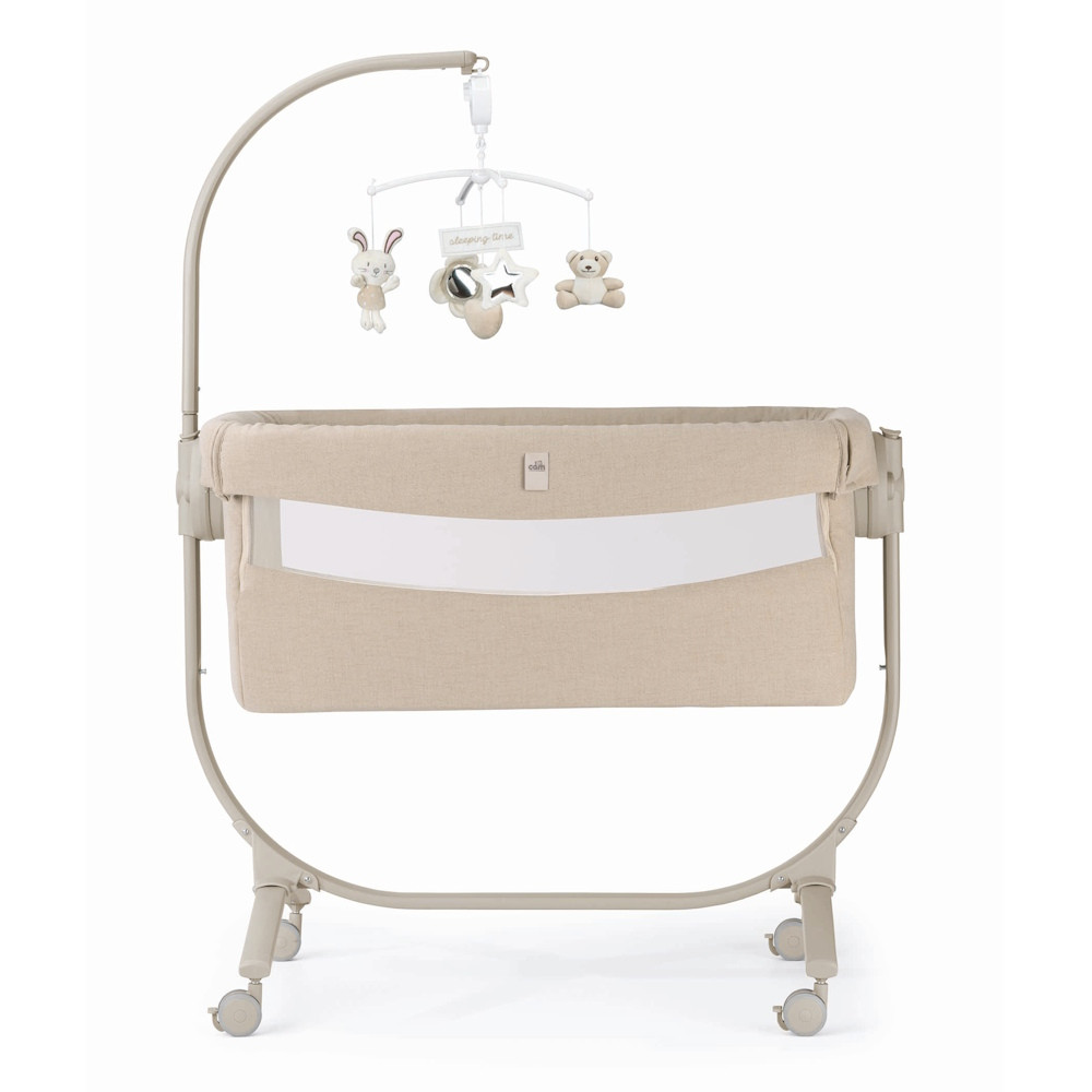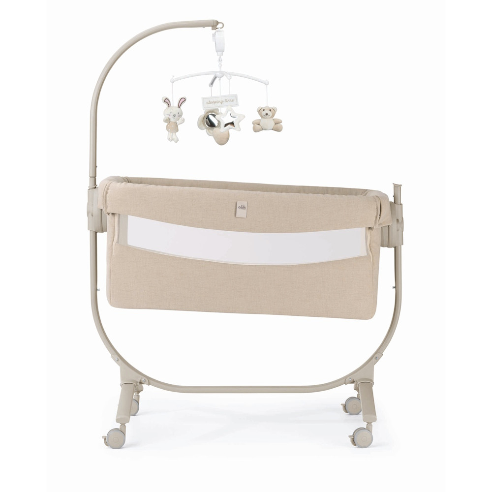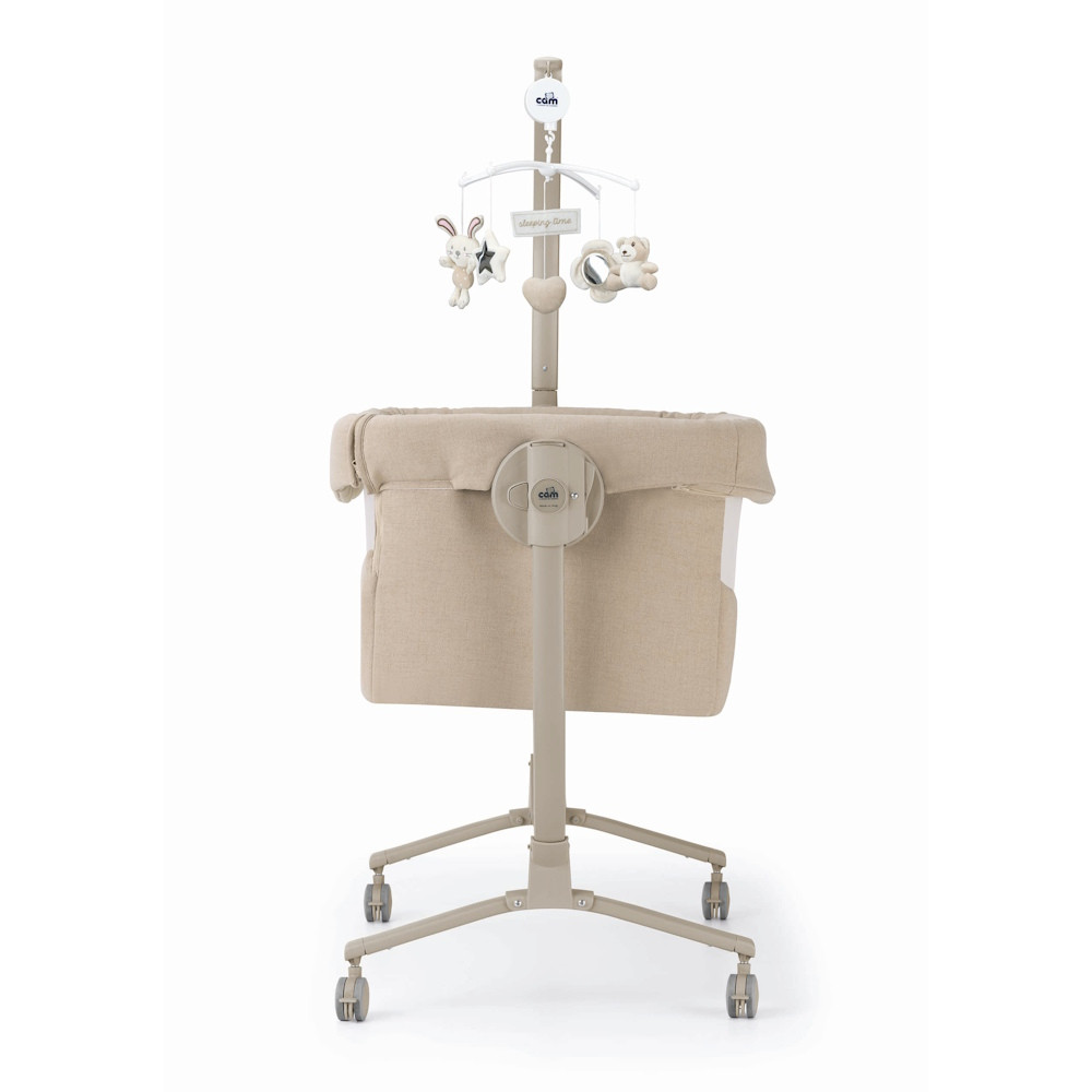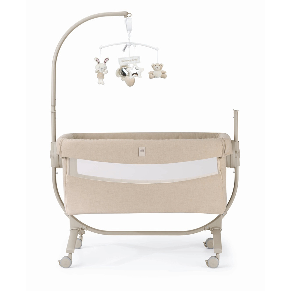 Tartalma: fém váz, levehető rúd szúnyoghálóhoz és zenélő forgóhoz, puha matrac, puha anyagú belső huzat, hálós ablak. Levehető és kézzel, maximum 30°C-on mosható anyagok.
