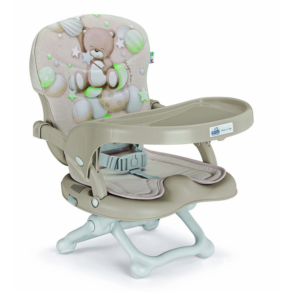 univerzális rögzítőrendszer állítható hevederekkel, 4 magasság (0-18 cm), levehető széles tálca, anatómiai ülés puha, levehető huzattal, 3 pontos biztonsági öv, csúszásmentes lábak. Követi a baba növekedését: ideális hordozható etetőszékként kisebb babáknak, és ülésemelőként nagyobb gyermekek számára, akik szeretnének a szülőkkel az asztalhoz ülni. Szivaccsal könnyen tisztítható, a huzat levető és 30°C-on mosható.
