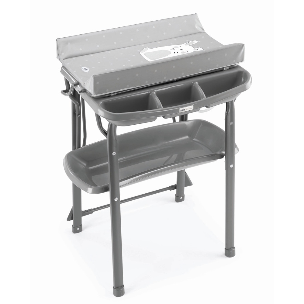 Fürdetőállvány kihúzható pelenkázólappal, hogy a babát az édesanya fürdetés után kényelmesen rátehesse a pelenkázóra (puha pelenkázólap leesésgátló rendszerrel); kád 2 csúszásmentes, anatómiai formájú üléssel (egyik oldalon fektetve, 0-6 hónapos korig, másik oldalon ültetve, 6-12 hónapos korig), eszköztároló rekeszek, dugó és vízleeresztő cső, tároló polc. Ideális megoldás kis fürdőszobákba, akár a WC kagyló fölé is tolható (a tároló polc 40,5 cm magasan van).