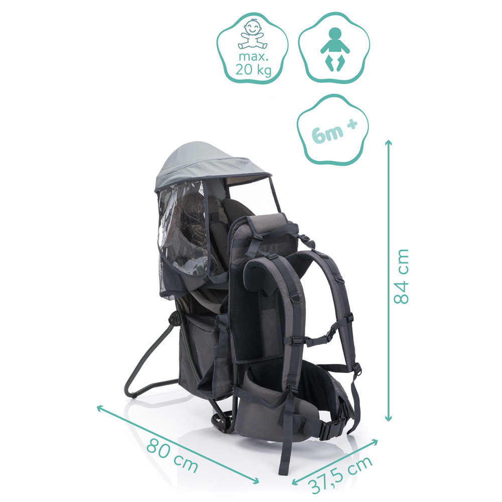Az ülés puha és kényelmes párnázással van ellátva, míg az összes heveder többfunkciósan állítható. Az Elite hátsó hordozó lábpántokkal is rendelkezik, amelyek optimális könnyítést biztosítanak gyermeke lábának túrázás közben. Ez még nagyobb kényelmet és biztonságot biztosít. A nap- és esőernyő könnyen rögzíthető, és optimális védelmet nyújt minden időjárási körülmény ellen.
