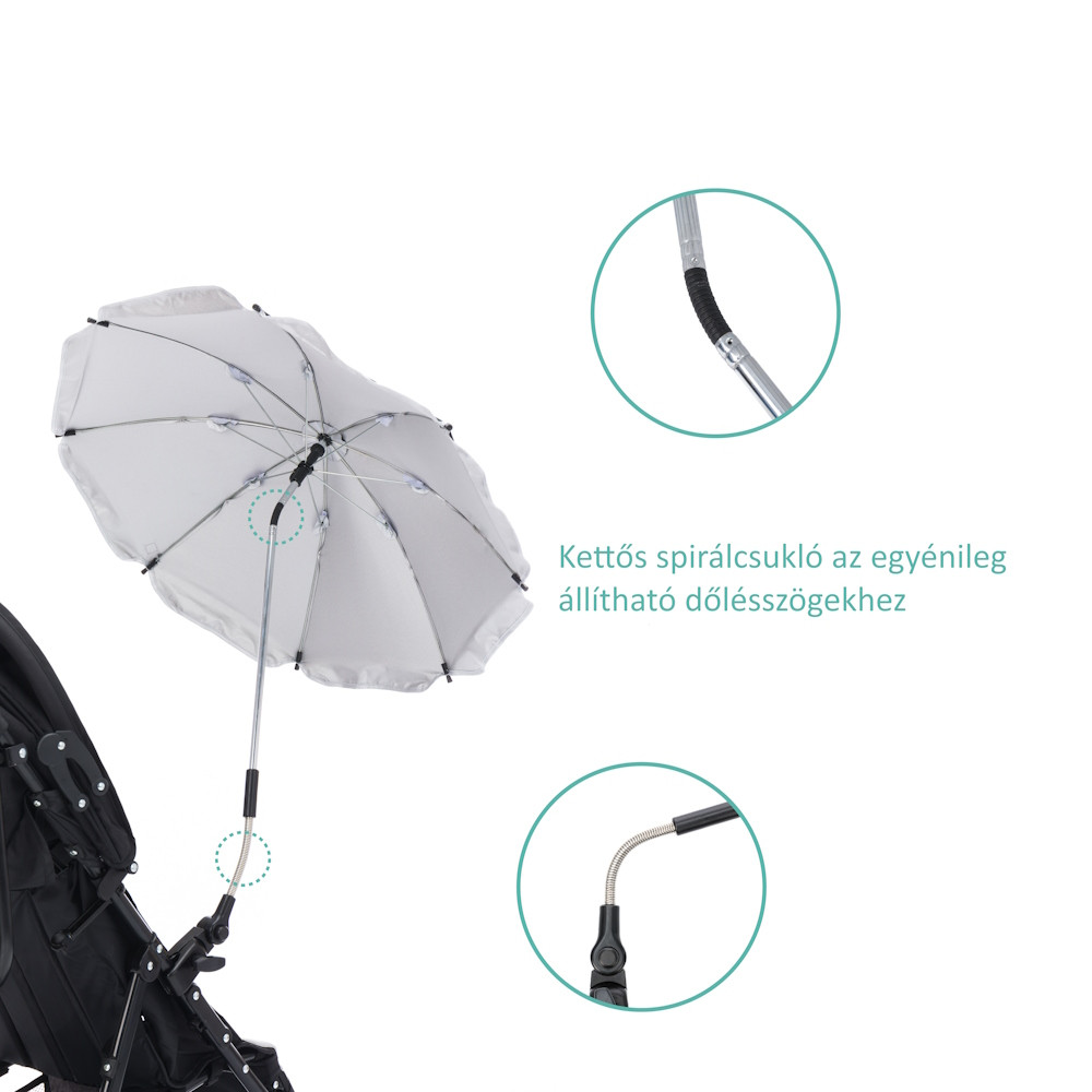 Az univerzális rögzítőelem henger és ovális csövekre való rögzítsére alkalmas, így a legtöbb babakocsihoz és sportbabakocsihoz illeszkedik. A hajlítóelemek optimálisan és egyedileg állíthatóvá teszik a napernyő dőlésszögét. A napernyők anyaga poliészter, 50 pluszos UV védőbevonattal és vízlepergető is. Ez az anyag egyszerű és praktikus tisztítást tesz lehetővé.
