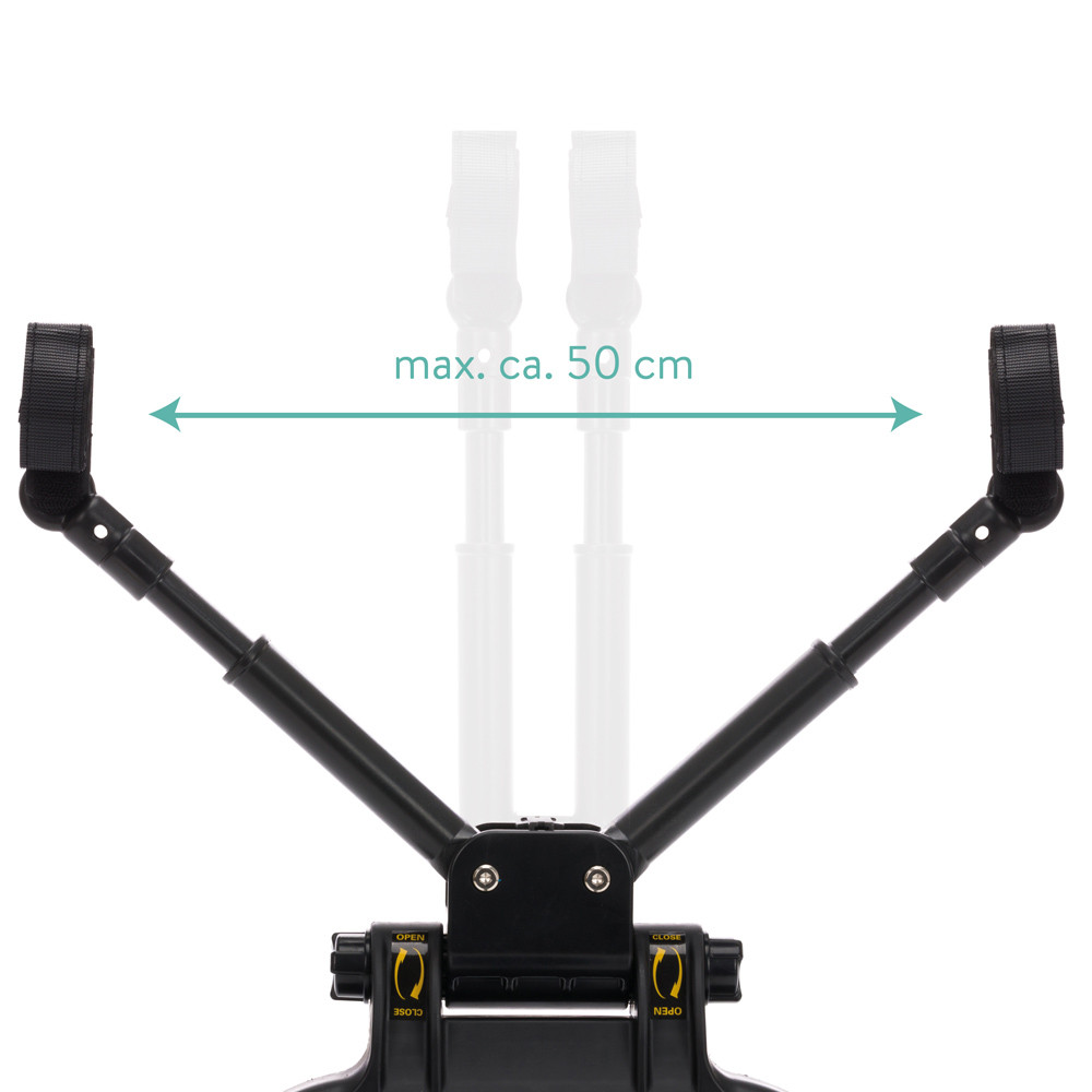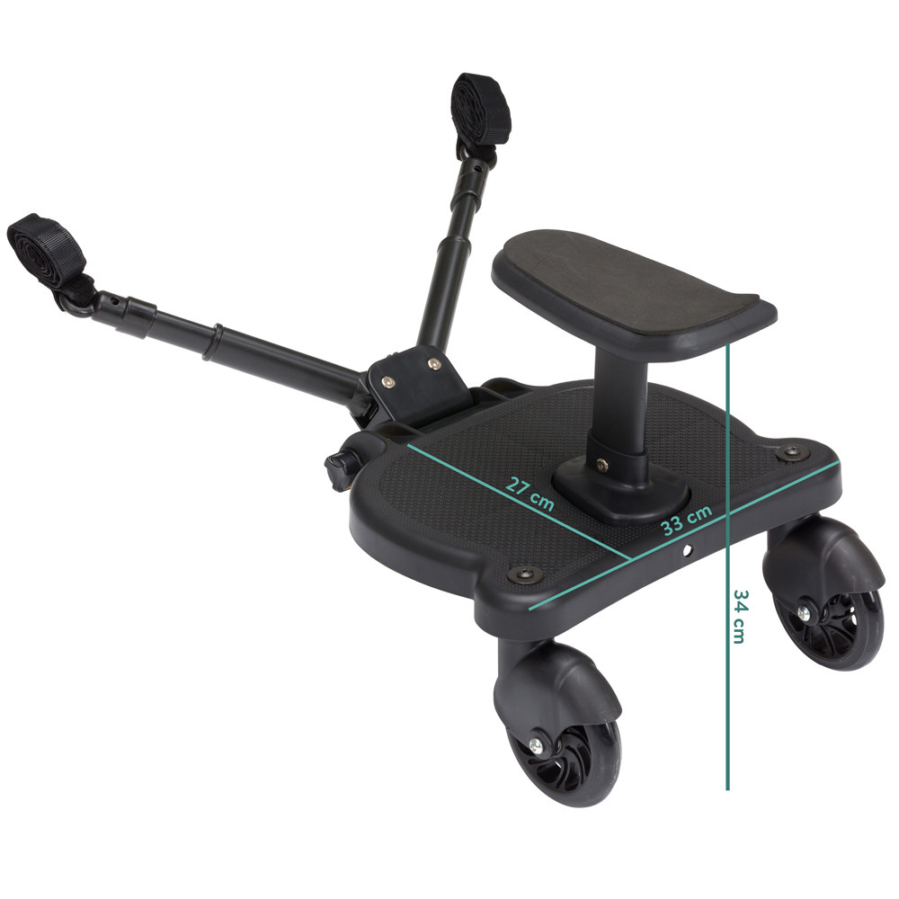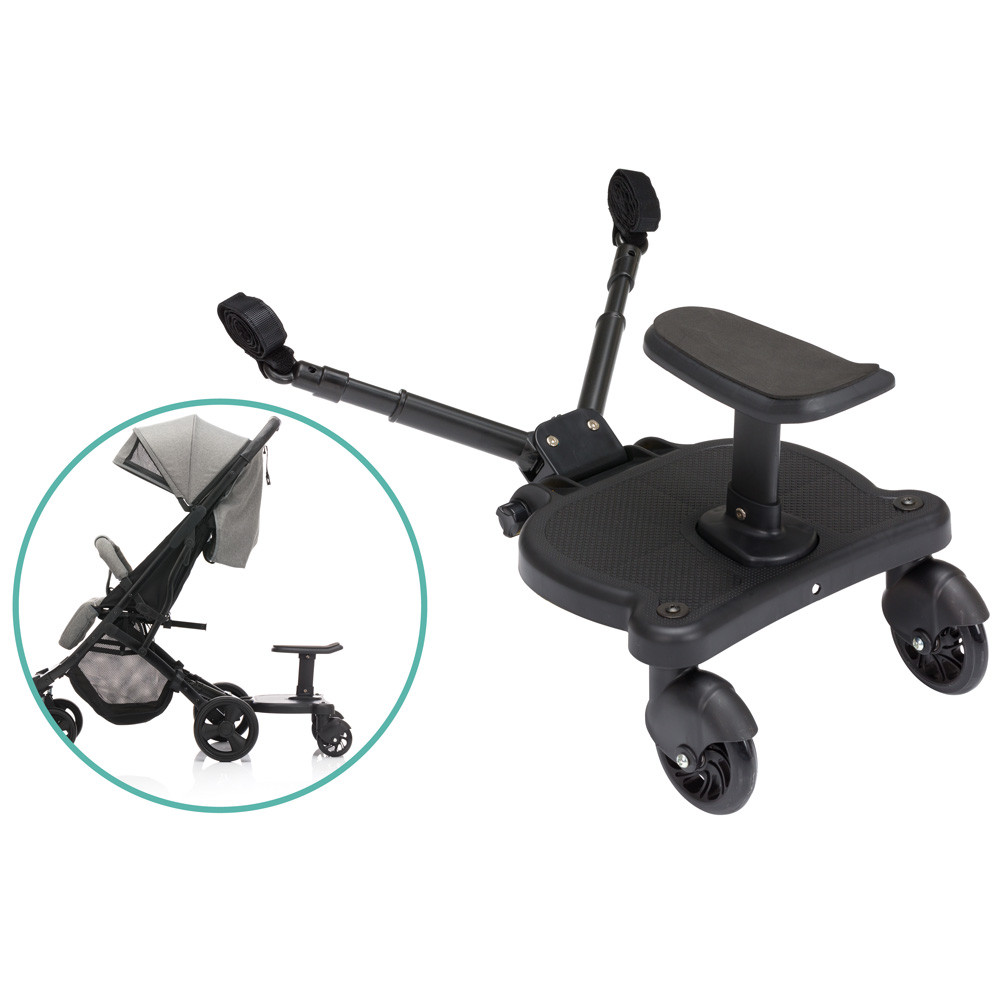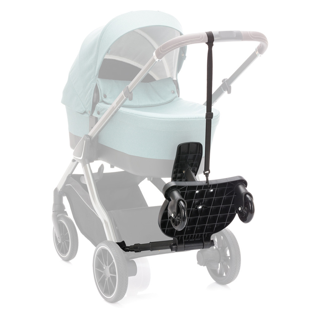 Ha a gyermeknek éppen nincs szüksége a testvérfellépőre, egyszerűen rögzítheti a babakocsi tolókarjához egy pánttal.