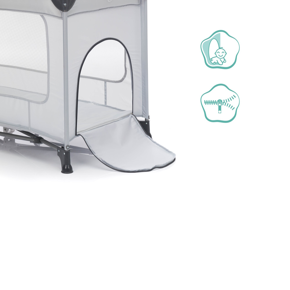 - Az utazóágy rövidebb oldalán lévő cipzárral nyíló kibúvón át a nagyobb gyerekek önállóan be- vagy kimászhatnak.