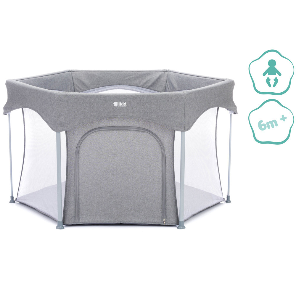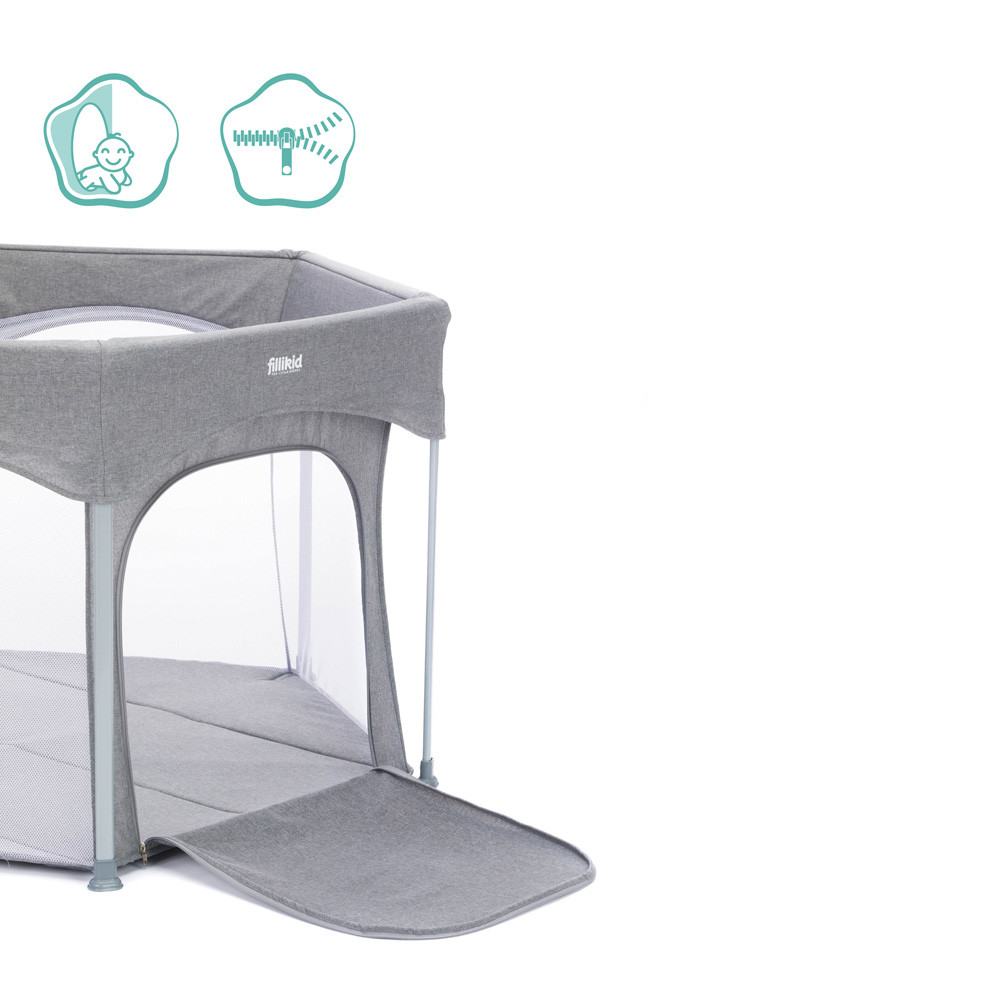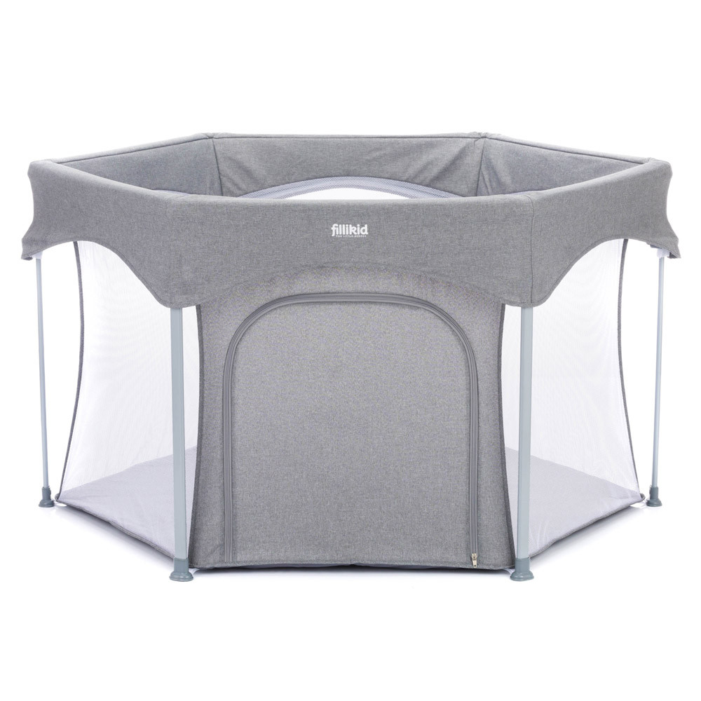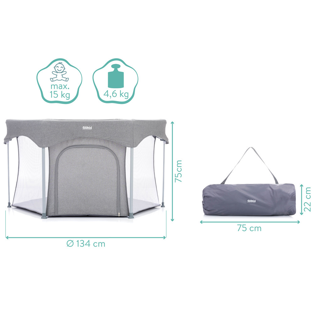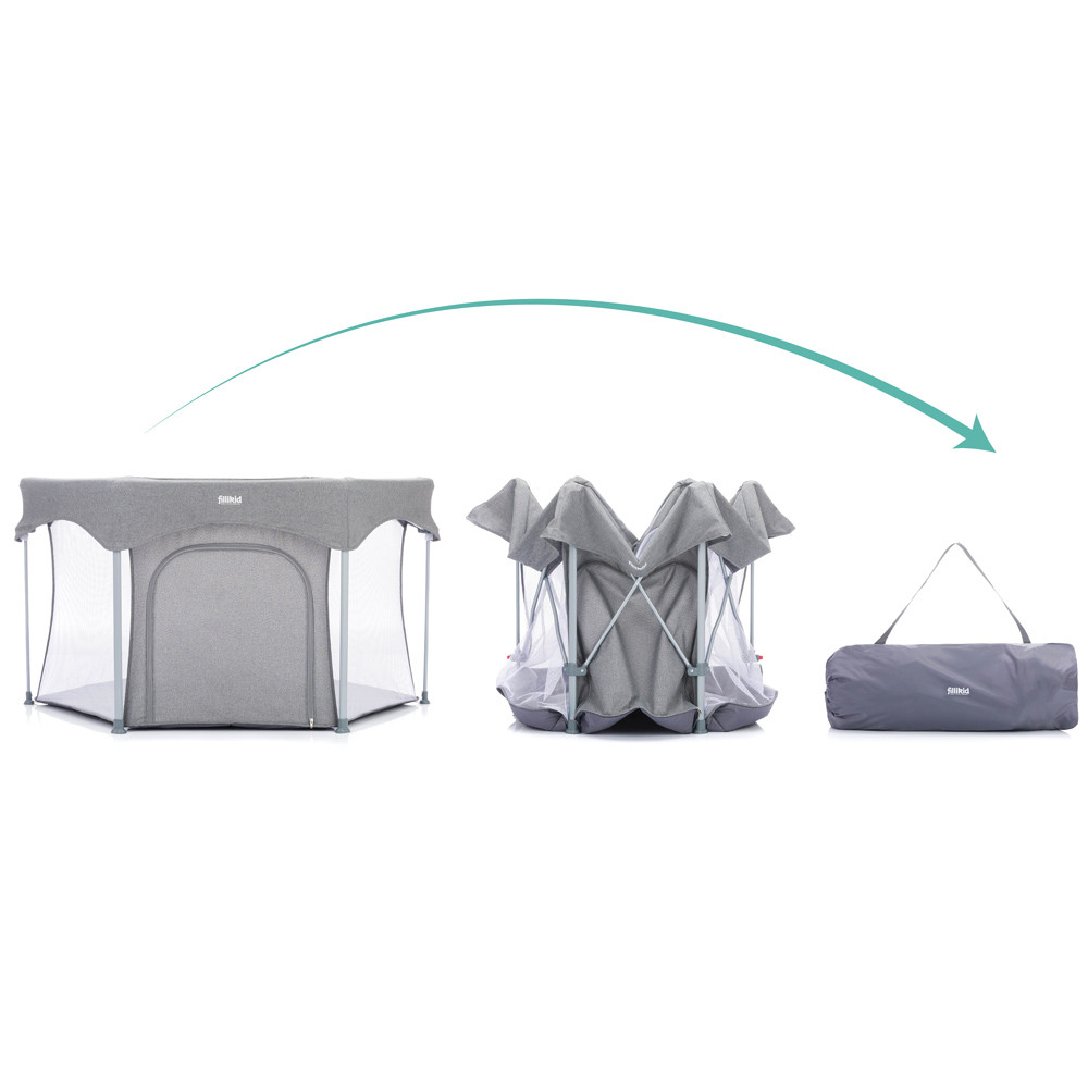 A házban, lakásban gyakran vannak olyan veszélyes dolgok, amelyek mászkáláskor, sétáláskor veszélyt jelenthetnek az aktív babákra. Ez a Fillikid hatszögletű járóka nagyobb biztonságot nyújt kis kedvesének. A párnázott alap hangulatos játékfelületet és extra meleget biztosít a hideg járólap vagy parketta ellen. A járóka két egyszerű lépésben kinyitható és összecsukható. A szállítótáskával könnyedén összepakolhatod és magaddal viheted mindenhova, hogy babád mindig biztonságban tudjon benne játszani. A hálós oldalfalaknak köszönhetően szemmel tarthatod babádat, és a levegő keringhet a járókában. Oldalán cipzár található, így gyermeke felügyelet mellett önállóan tud ki- és bemászni.