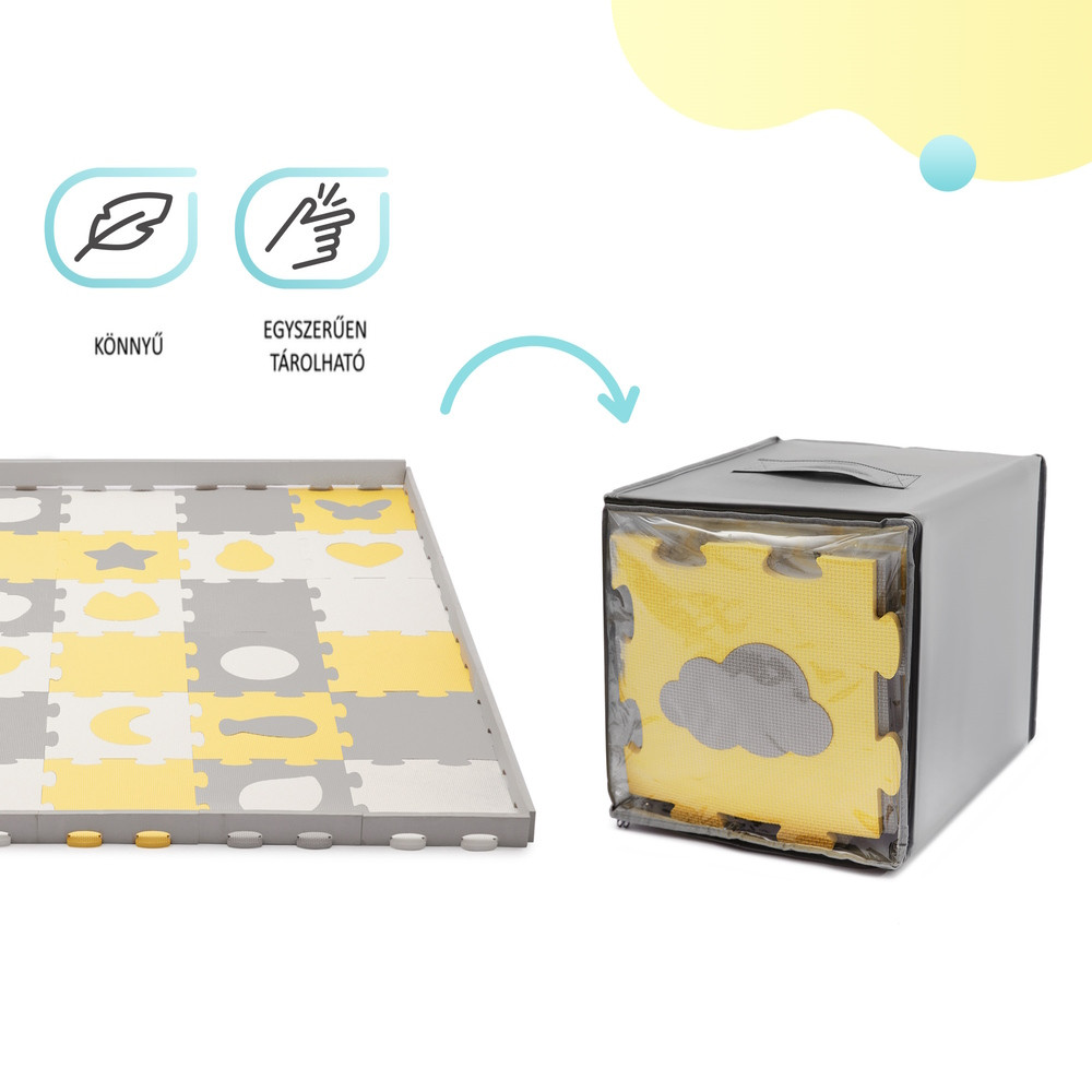 A habszivacs szőnyeg 30 puzzle-ből áll (15-nek a közepén kivágott alakzatok vannak), amelyeket tetszőleges módon lehet összeilleszteni. A maximális felülete 185 x 165 cm, így a LUNO SHAPES megfelelő játékfelületet biztosít a gyermek számára. A szélső puzzle lapok felemelhetők