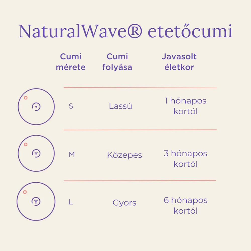 Etetésre: kompakt kialakítás a jobb stabilitást szolgálja, NaturalWave természetes hullámvonalú etetőcumival.