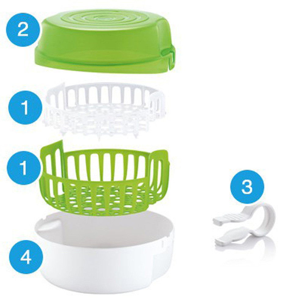 A Mam mikrohullámú sterilizáló doboz segítségével a háztartásokban előforduló baktériumok 99%-át eltüntetheted a kisbabád által használt cumisüvegekről és cumikról. A legtöbb mikrohullámú sütővel kompatibilis.
