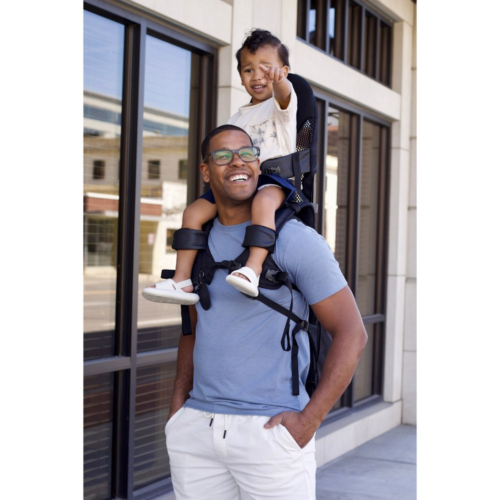 Miközben felfedezed a világot, gyermeked biztonságosan ül a válladon, és egy derékszíjjal, valamint lábszíjakkal van rögzítve, mindkettő stílusos műbőr részletekkel.