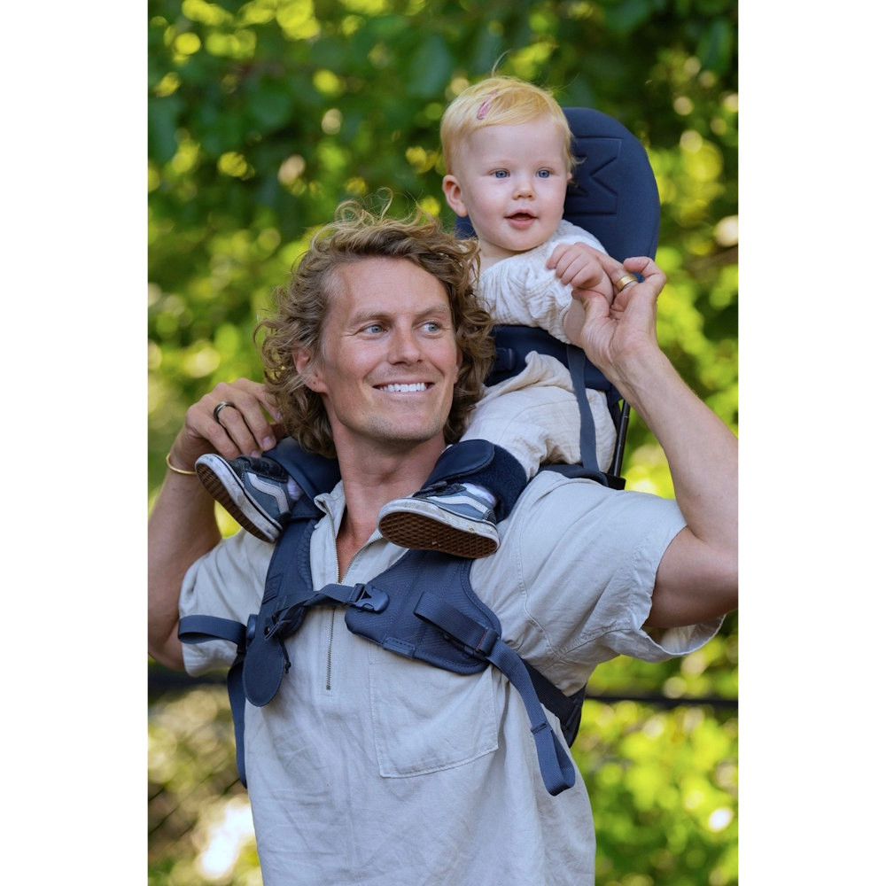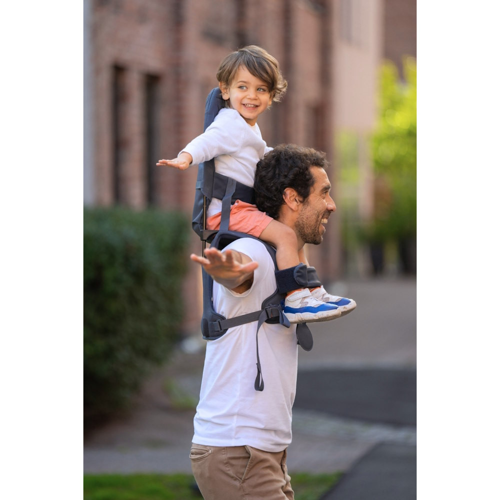 Miközben felfedezed a világot, gyermeked biztonságosan ül a válladon, és egy derékszíjjal, valamint lábszíjakkal van rögzítve, mindkettő stílusos műbőr részletekkel.