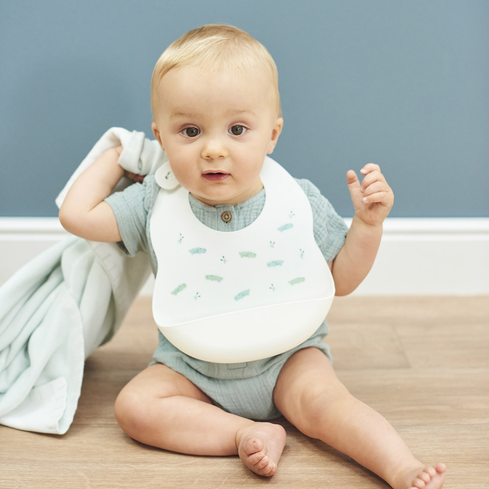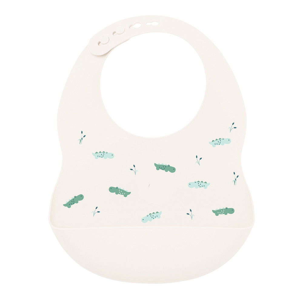 Szilikon előke, állítható nyakbőséggel, morzsafogó zsebbel.