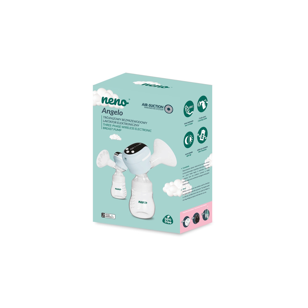 A Neno Angelo vezeték nélküli, így otthoni és otthonon kívüli használatra is ideális. Kompakt kialakításának köszönhetően a Neno Angelo mindössze 392 grammot nyom, így könnyen elfér kis helyen is. Ezenkívül a mellszívó vezeték nélküli, feltöltés utáni működési ideje körülbelül 2 óra.