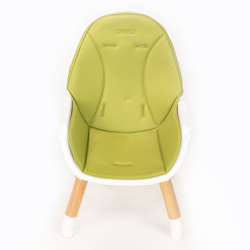 A szék puha vállpárnákkal ellátott biztonsági övvel van felszerelve, hogy megvédje a gyermeket a horzsolásoktól. A kárpit eco-bőrből készült, amely ellenáll a szennyeződéseknek és könnyen tisztán tartható - csak nedves ruhával és enyhe szappannal tisztítsa meg. A tálcán van egy bemélyedés, amely megakadályozza a tárgyak elcsúszását, és két lyuk van az üveg vagy bögre elhelyezéséhez. A Grace szék könnyű és stabil felépítésű. A lábak gumi lábakkal rendelkeznek, amelyeknek köszönhetően a szék védett az elmozdulás ellen. Etetőszék változatban 6–36 hónapos korig vagy 15 kg súlyig, gyerekszék és asztal változatban 3–6 éves korig vagy 25 kg súlyig alkalmas.