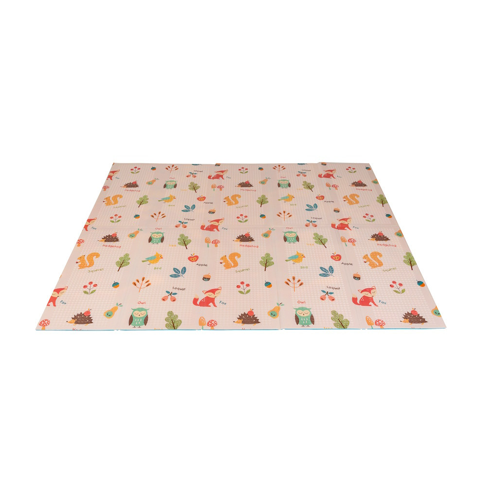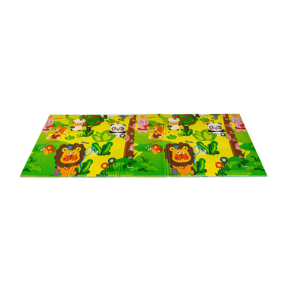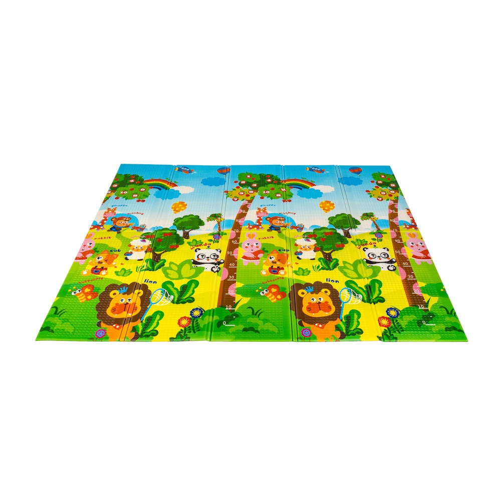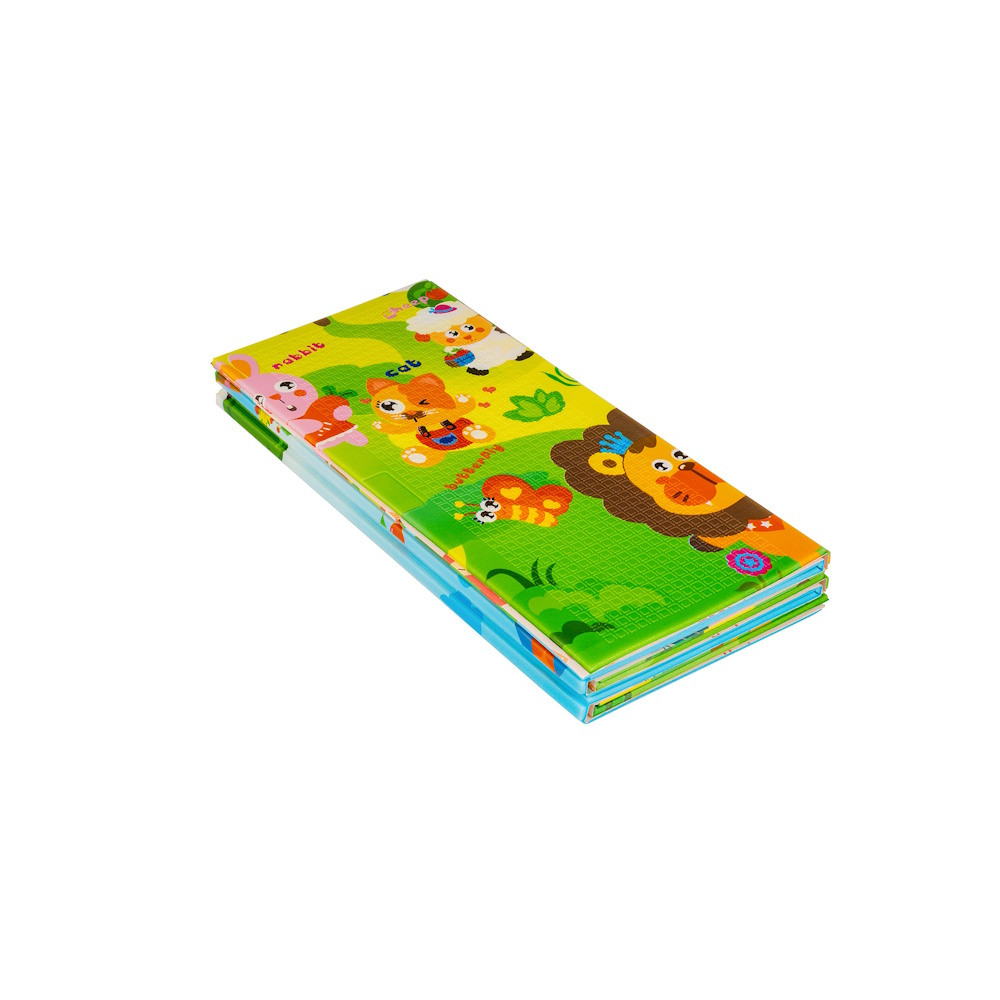 A kétoldalú összehajtható szőnyeg színes és változatos mintákat és textúrákat kínál, amelyek segítik fejleszteni a babák látását és tapintását. Tele van állatok képeivel, amelyek támogatják a legfiatalabb felhasználók intellektuális és motoros fejlődését.