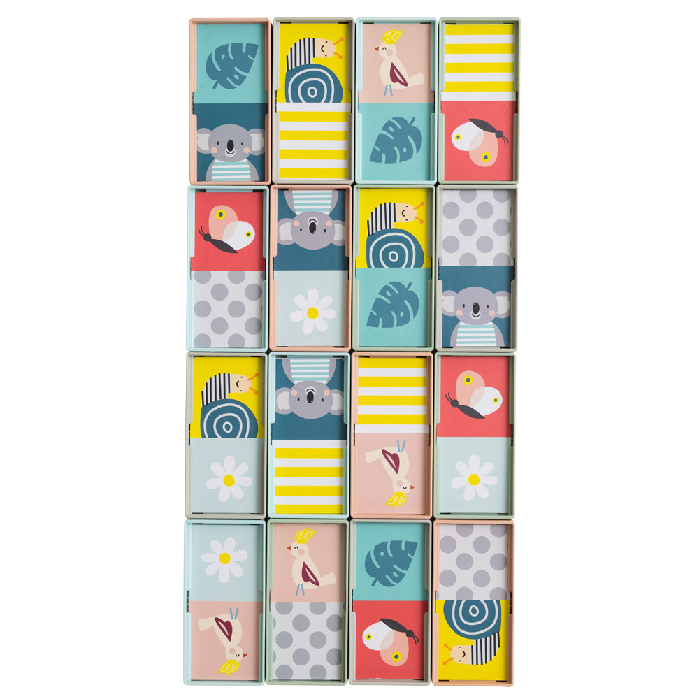 A hatalmas kétoldalas dominólapok (6x12 cm) passzolnak a kisgyermekek kis kezéhez, miközben illeszkednek a fejlődési szakaszukhoz. Oktatás és tanulás játékon keresztül.
