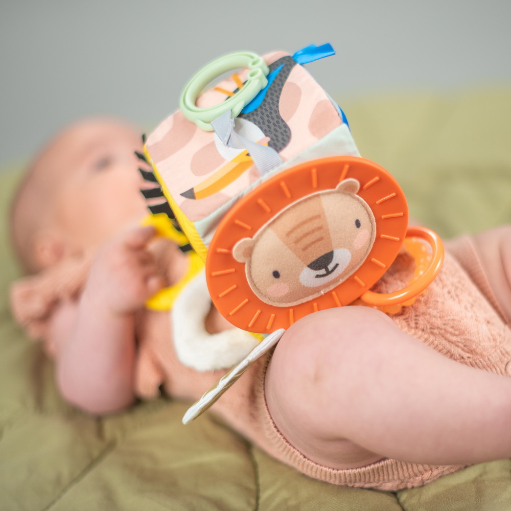 A Taf Toys készségfejlesztő játékkocka egy felakasztható puha kocka, tele tevékenység-lehetőségekkel, illusztrációkkal és szórakozással