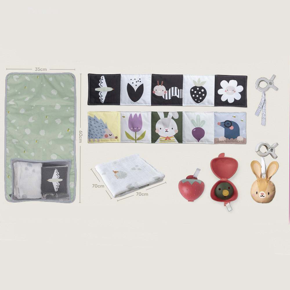 A készlet tartalmaz egy nagy bambusz textil pelenkát, egy hordtáskává összehajtható pelenkázólapot (amely tartalmazza a készlet összes termékét), két műanyag csipeszt, egy eper formájú cumitartó tokot, egy csörgő nyuszit és egy puha kétoldalas bébikönyvet.