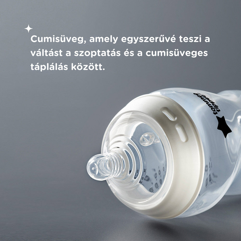 • Kólika elleni szeleppel: A TommeeTippeeNatural Start etetőcumik innovatív kólika elleni szeleppel rendelkeznek, amelyek csökkentik a levegő bejutását, és a kólikás hasfájás tüneteit.