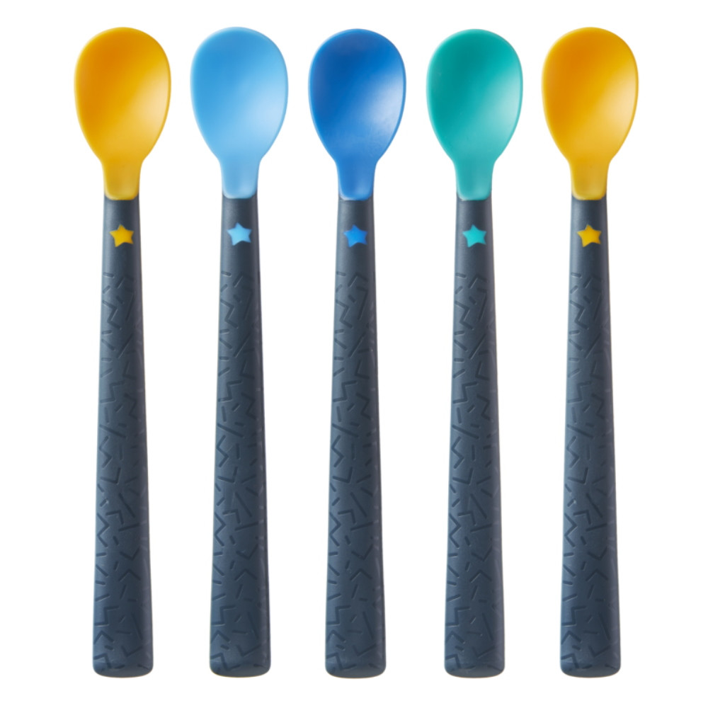 Az 5 darabos, divatos színű etetőkanalak közül a kisfiúk és kislányok is megtalálják a kedvencüket. Kifejezetten az első igazi szilárd falatokhoz tervezve. A puha, rugalmas, lapos fej gyengéd a kis szájacskákhoz és az érzékeny ínyekhez, így nem okoznak kellemetlenséget, miközben a finom falatok célba érnek.