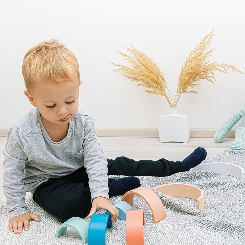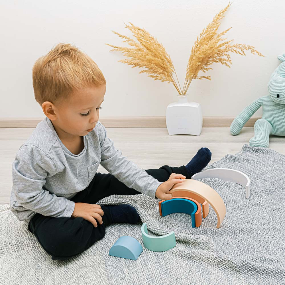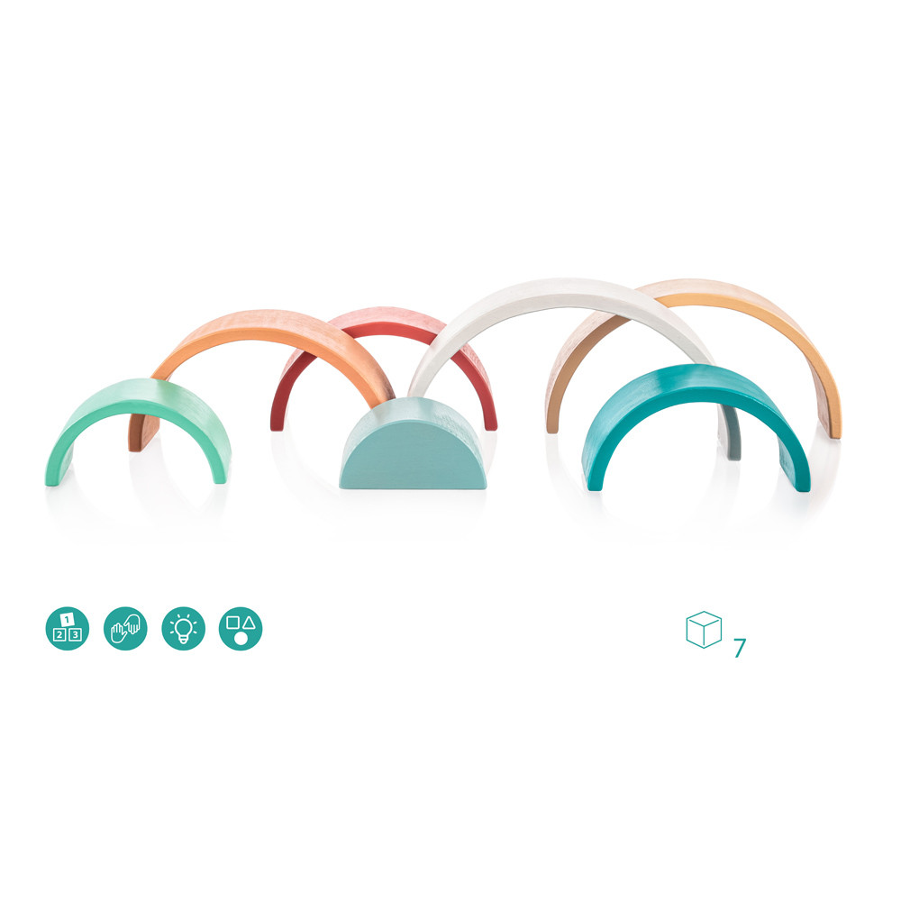 Az aranyos szivárvány formájú és színű játék nagyszerű segítőtárs a gyerekek motorikus fejlődéséhez, képzelőerejének és kreativitásának fejlesztéséhez. A kirakós játékból különféle formákat lehet létrehozni. A készlet 7 színes, minőségi bükkfából készült darabot tartalmaz.